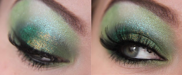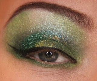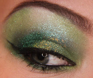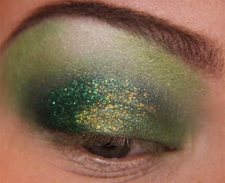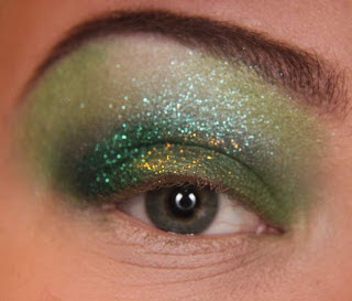 Continuando, aplique um pouco (pouco mesmo) glitter ou pigmento no tom dourado bem no meio da pálpebra móvel, faça exatamente como aplicado anteriormente com o glitter verde.