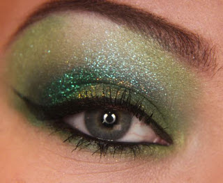 Agora, bem no canto externo da pálpebra móvel aplique glitter verde ou pigmento verde. Nessa etapa o melhor é aplicar com o dedo, caso o glitter não grude, aplique um pingo de gel fixante de glitter e sobre ele o glitter ou pigmento.