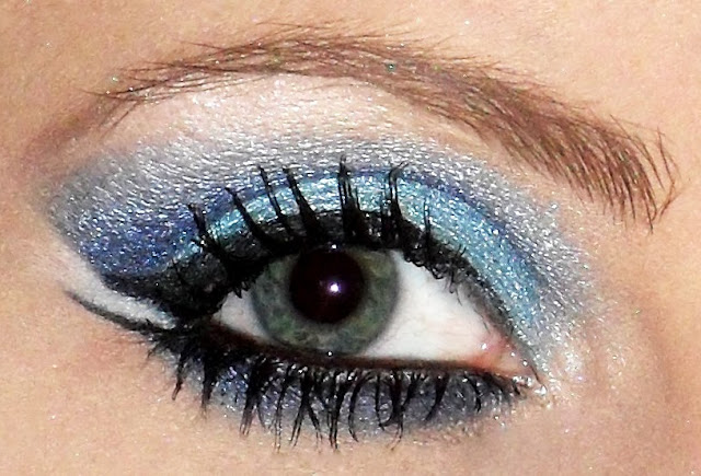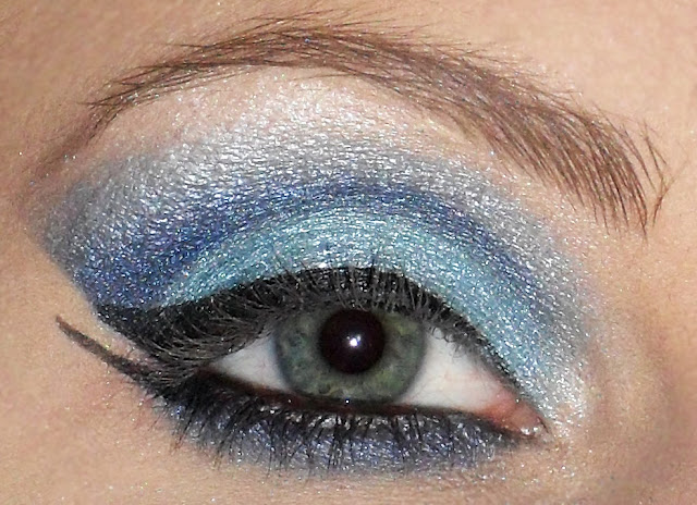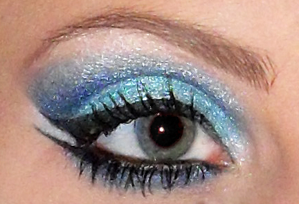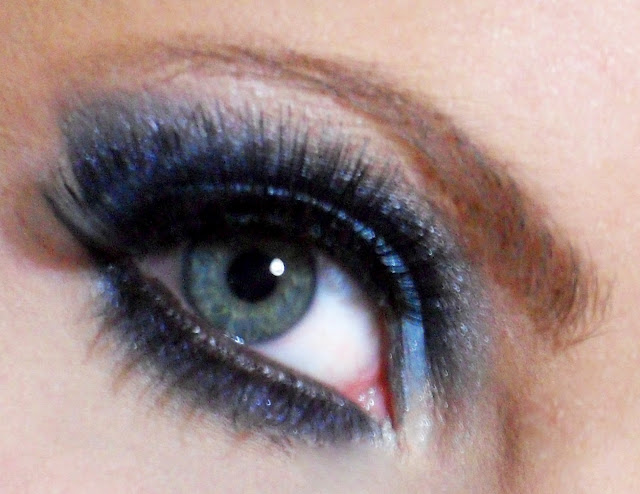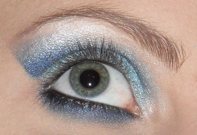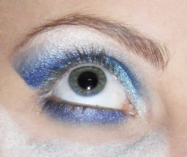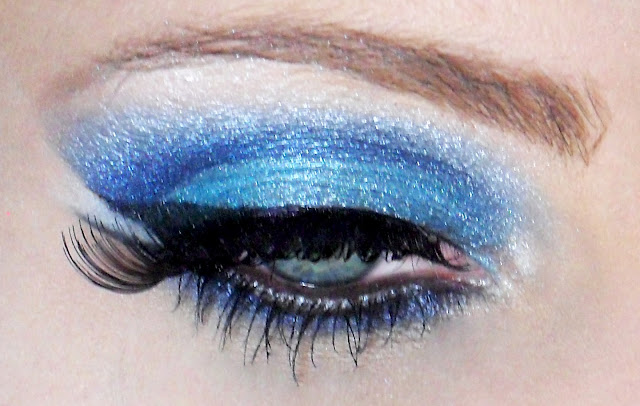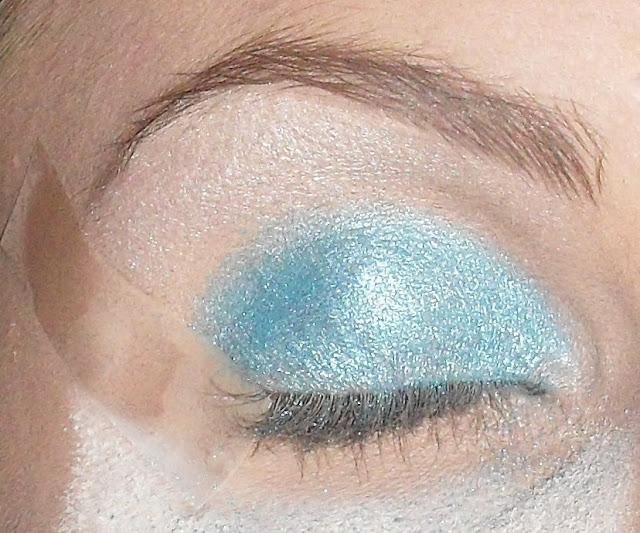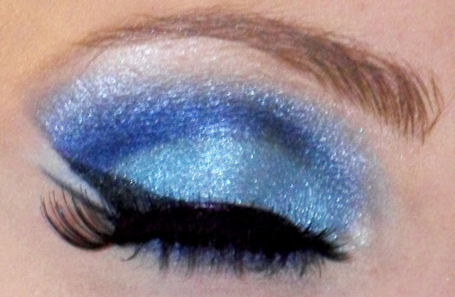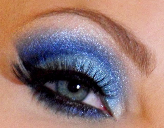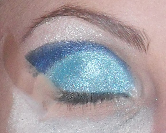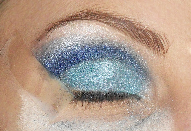 Aplique uma sombra azul escuro bem no concavo dos olhos para cima em direção a sobrancelha. Use um pincel molhado para esta etapa para obter uma linha muito definida no côncavo. Esta sombra deve ser maior no canto externo do olho, e afilado em direção ao canto interno.