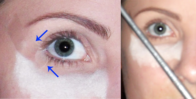 Para ter os cantos realmente definidos, coloque um pedaço de fita adesiva no canto externo do olho. A fita deve aplicada no ângulo que segue uma linha a partir da borda do seu nariz, passando pelo canto do olho, até o fim de sua sobrancelha como ilustrado à direita.